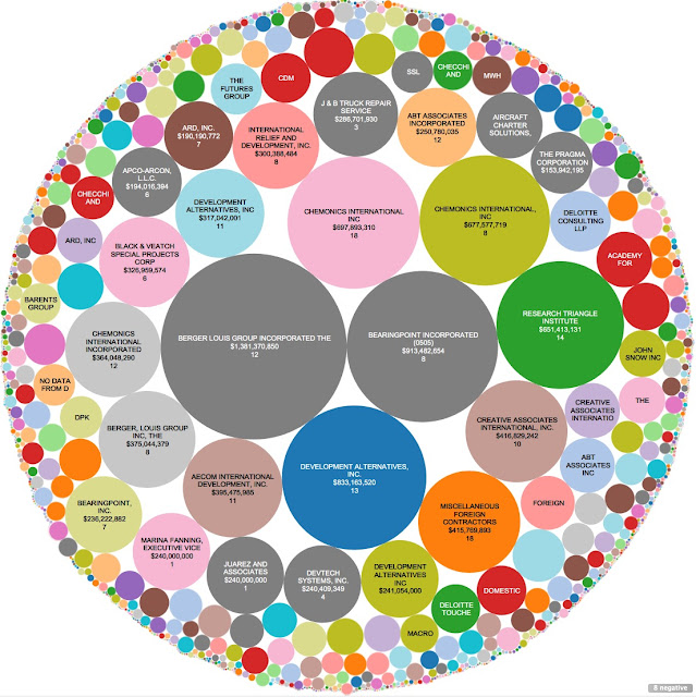 This visualization shows $16,768,294,568 in U.S. Agency for International Development contracts. It has the look of a strange solar system with the small contractors and start-ups revolving around such giants as Chemonics International and the Berger Louis Group.
