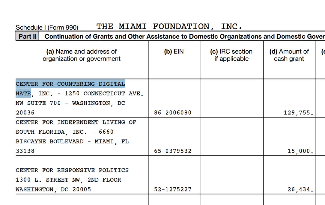 The Miami Foundation granted nearly $130,000 in program support to CCDH’s Washington, D.C. nonprofit — the U.S. arm of the same UK-based group coordinating covert campaigns to silence Americans.