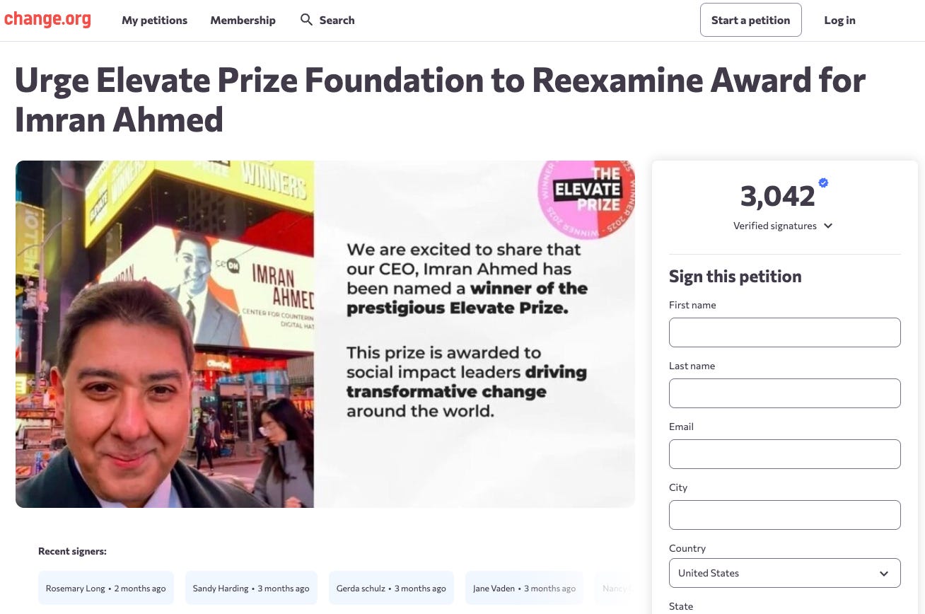 The Elevate Prize Foundation awarded CCDH CEO Imran Ahmed a $300,000 prize and global amplification — right as he was being accused of black operations, election meddling, and unlawful foreign influence.