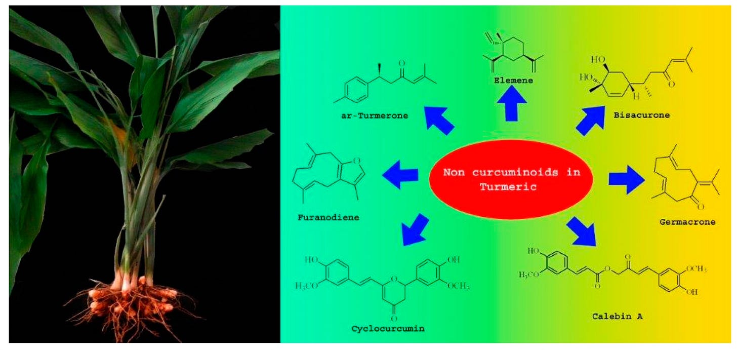 [Image from: Nair, A.; Amalraj, A.; Jacob, J.; Kunnumakkara, A.B.; Gopi, S. Non-Curcuminoids from Turmeric and Their Potential in Cancer Therapy and Anticancer Drug Delivery Formulations. Biomolecules 2019, 9, 13. https://doi.org/10.3390/biom9010013]