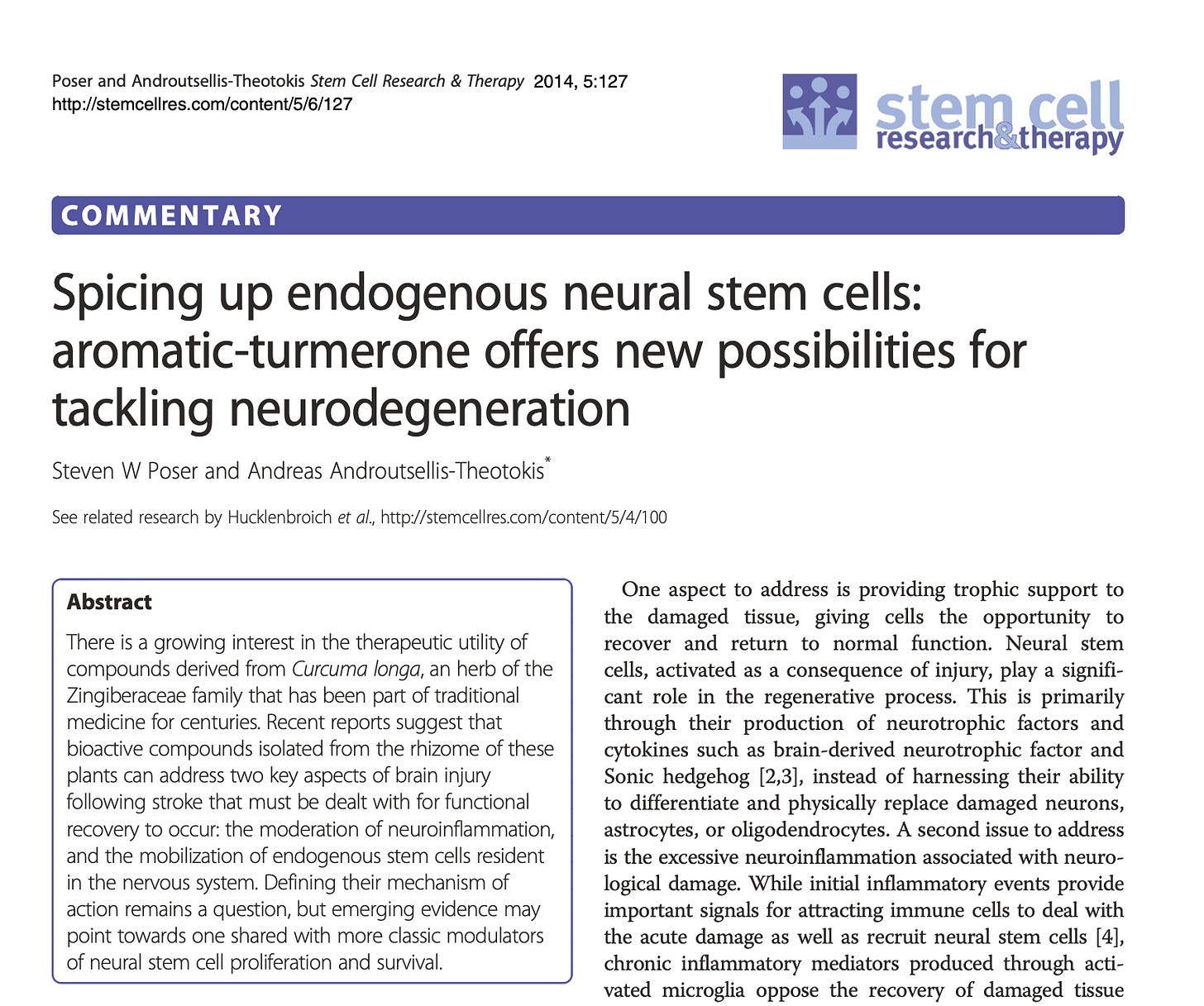 2. Poser SW, Androutsellis-Theotokis A. Spicing up endogenous neural stem cells: aromatic-turmerone offers new possibilities for tackling neurodegeneration. Stem Cell Res Ther. 2014;5(6):127. doi: 10.1186/scrt517.