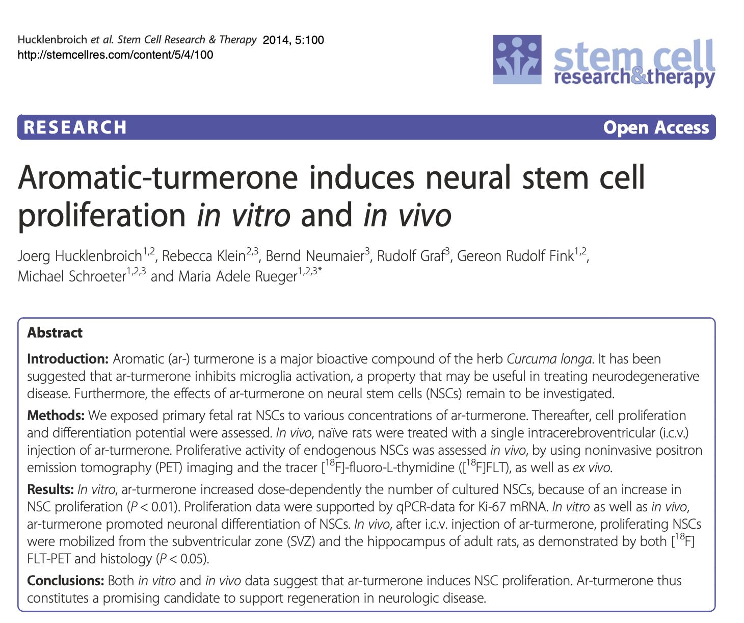 1. Hucklenbroich J, Klein R, Neumaier B, Graf R, Fink GR, Schroeter M, Rueger MA. Aromatic-turmerone induces neural stem cell proliferation in vitro and in vivo. Stem Cell Res Ther. 2014;5(4):100. doi: 10.1186/scrt500.