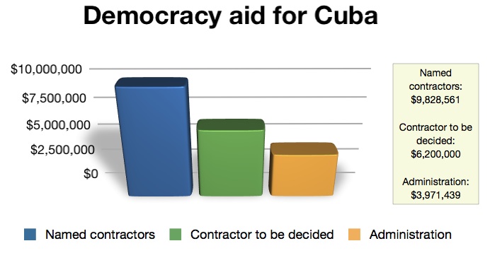 TBD (Contractor to be determined): Exchange of Ideas on Human Rights: $1,350,000. "This program will provide community leaders in Cuba with the opportunity to experience first-hand fundamental freedoms like freedom of expression and assembly, and how these freedoms are exercised in a an open and democratic context."