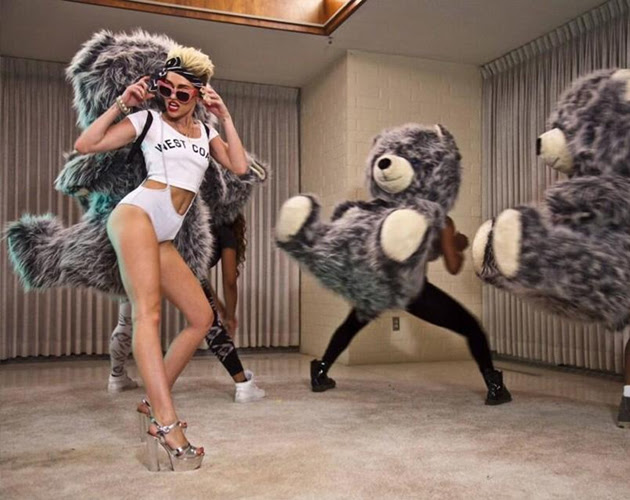 En el canal illuminati por antonomasia M(asón) TV, la Cyrus ya mostró todas sus sucias cartas trucadas, saliendo del Nabo de un Oso Abusador y poniéndose a cuatro para que otro MKUltra con el traje de cebra ajedrezado la fornicara en público. El Oso no falta en este infame vídeo, que llega a parasitar a los bailarines, con la simbología de que es un oso grande, esto es, mayor, abusador. Esto es lo último en música borregomátrix, tras el apocalíptico masón gangnam style y los borregomátrix celebran alborozados la agenda de guerra de los illuminati, con la nueva Guerra de Siria y su avance en el NOM. Con Aplausse aplauden la guerra y con We can´t stop expresan su júbilo de que no pude pararse su NOVUS ORDO SECLORUM y su Psicopatocracia anunnaki.