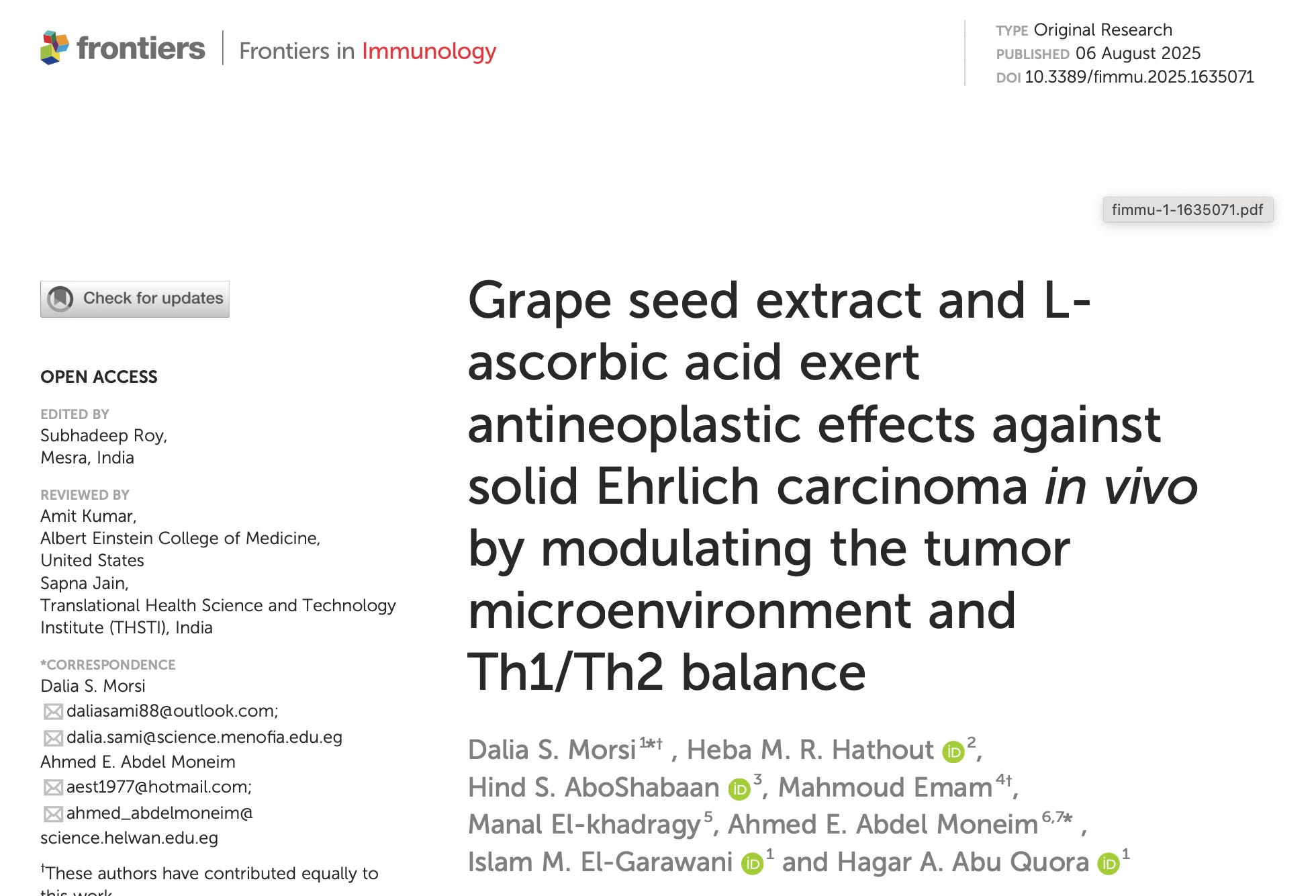 Morsi, D. S., et al. (2025). Grape seed extract and L-ascorbic acid exert antineoplastic effects against solid Ehrlich carcinoma in vivo by modulating the tumor microenvironment and Th1/Th2 balance. Frontiers in Immunology, 16, 1635071.