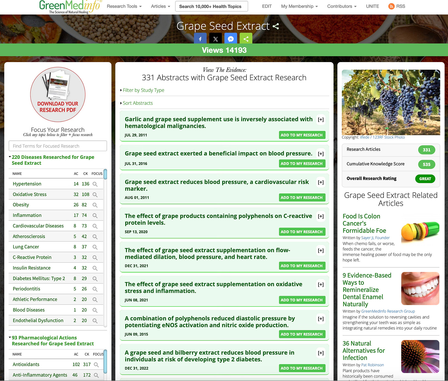 Learn more about the profound therapeutic value of grape seed demonstrated across over 200 different health conditions on the GreenMedInfo database.