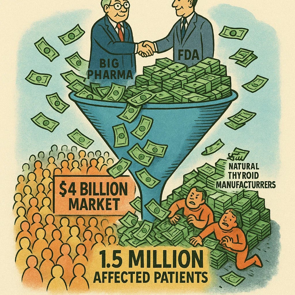 Synthetic levothyroxine costs 50-100 times less to produce than natural thyroid extract. When you can charge the same price for a product costing pennies versus dollars to make, eliminating competition becomes a business imperative.