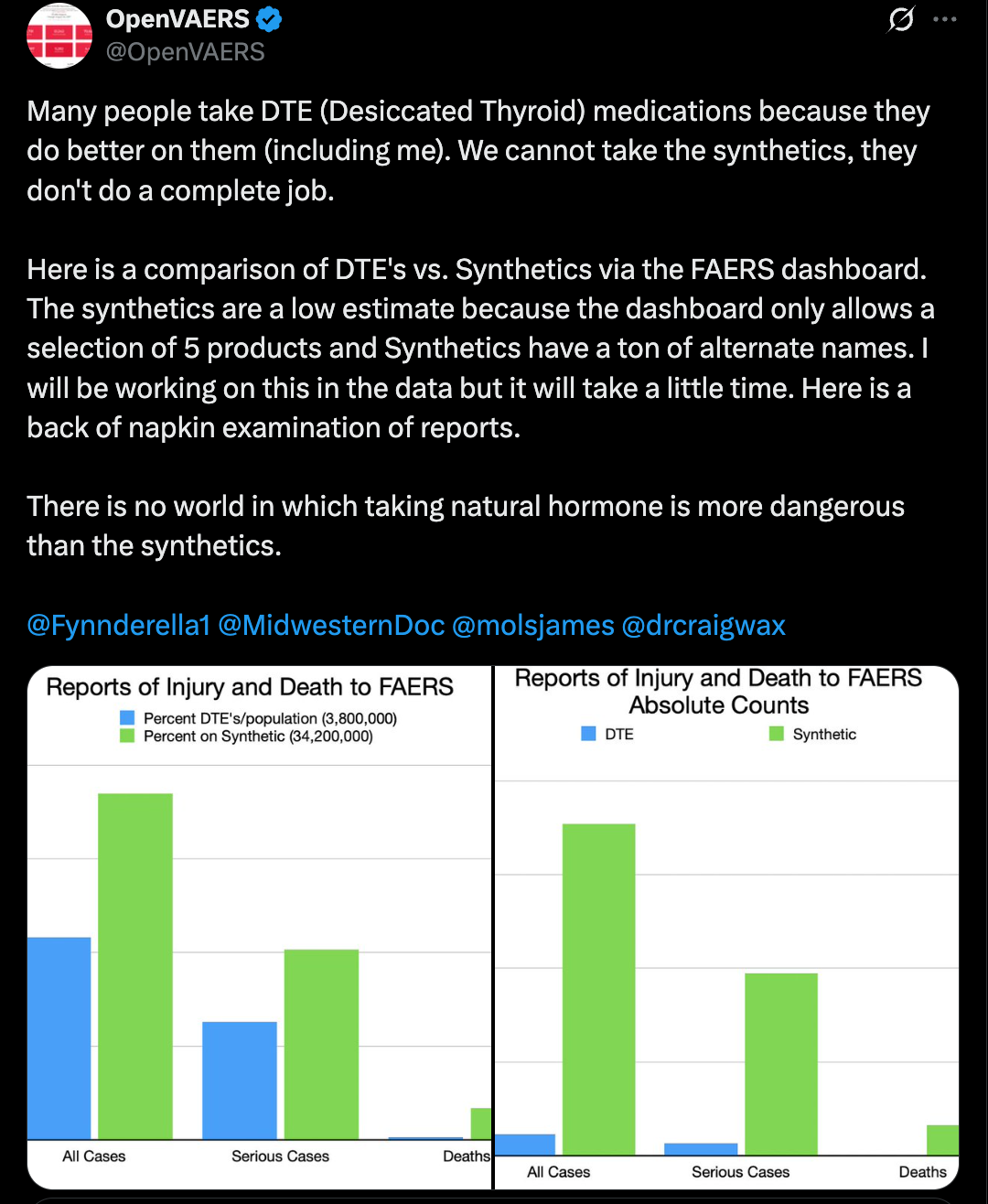 Most damning: the X account OpenVAERS's analysis of FDA's FAERS database shows synthetic medications have proportionally higher rates of injury and death, even accounting for larger user population.[14] Their conclusion: "There is no world in which taking natural hormone is more dangerous than the synthetics."