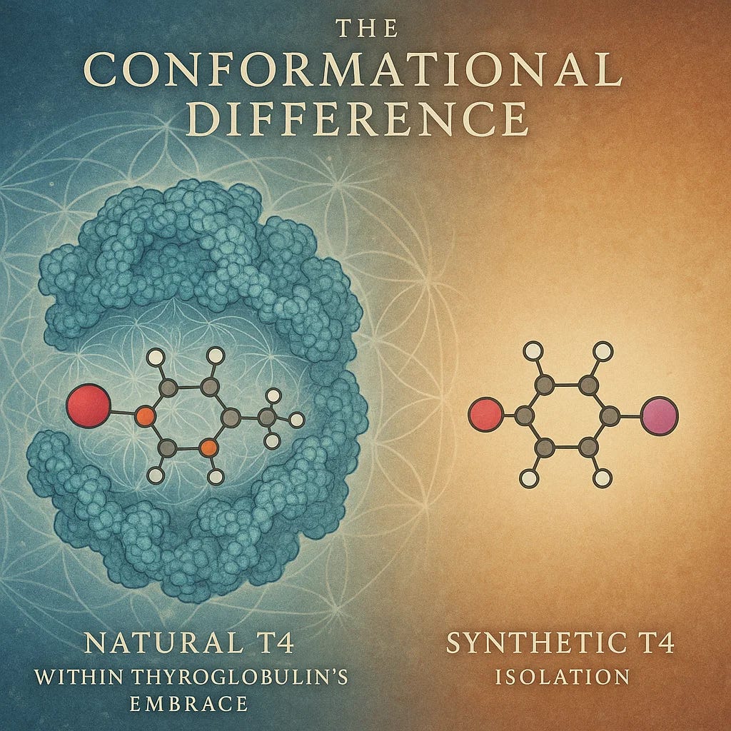1. Conformational Intelligence: Each hormone bound to thyroglobulin exists in a specific three-dimensional state that carries information. The protein presents hormones to the body in evolutionarily optimized conformations that synthetic hormones cannot replicate.