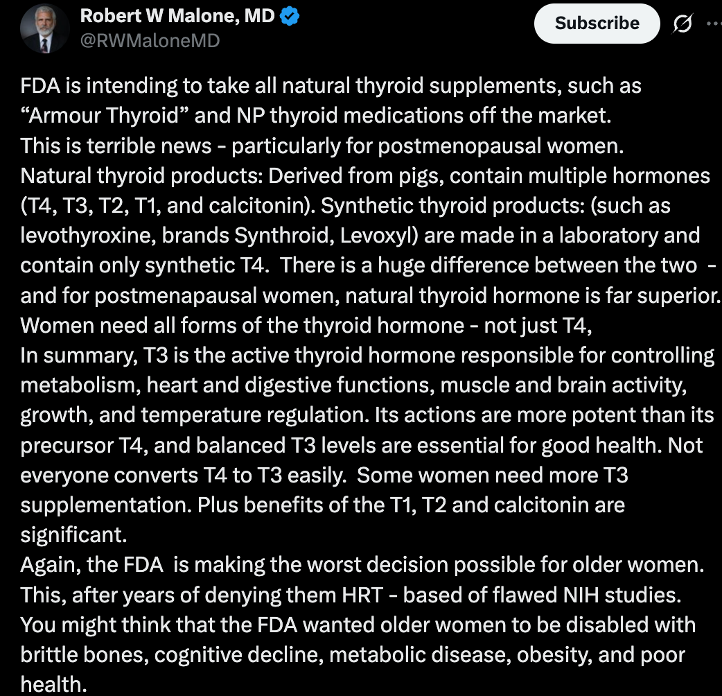 [1] Malone, R. "FDA Intent to Remove Natural Thyroid Supplements." X/Twitter post, 2025.
