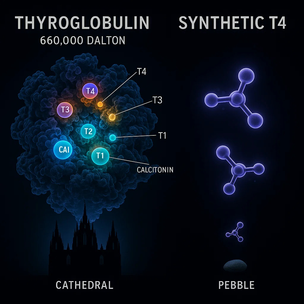 The image above exposes the breathtaking gulf between natural and synthetic thyroid hormone. Natural desiccated thyroid contains T4, T3, T2, T1, and calcitonin bound to the massive thyroglobulin protein—a 660,000 dalton molecular complex representing millions of years of evolutionary optimization. Each hormone exists in specific conformational states, held in precise spatial relationships, creating an information-rich matrix the body recognizes holistically.