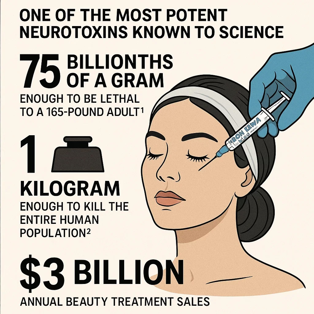 Botulinum toxin is one of the most potent neurotoxins known to science. A mere 75 billionths of a gram is enough to be lethal to a 165-pound adult.¹ It has been estimated that only 1 kilogram would be enough to kill the entire human population.² Yet, diluted and injected into facial muscles, it has become a commonplace beauty treatment with global sales hovering around $3 billion annually.³