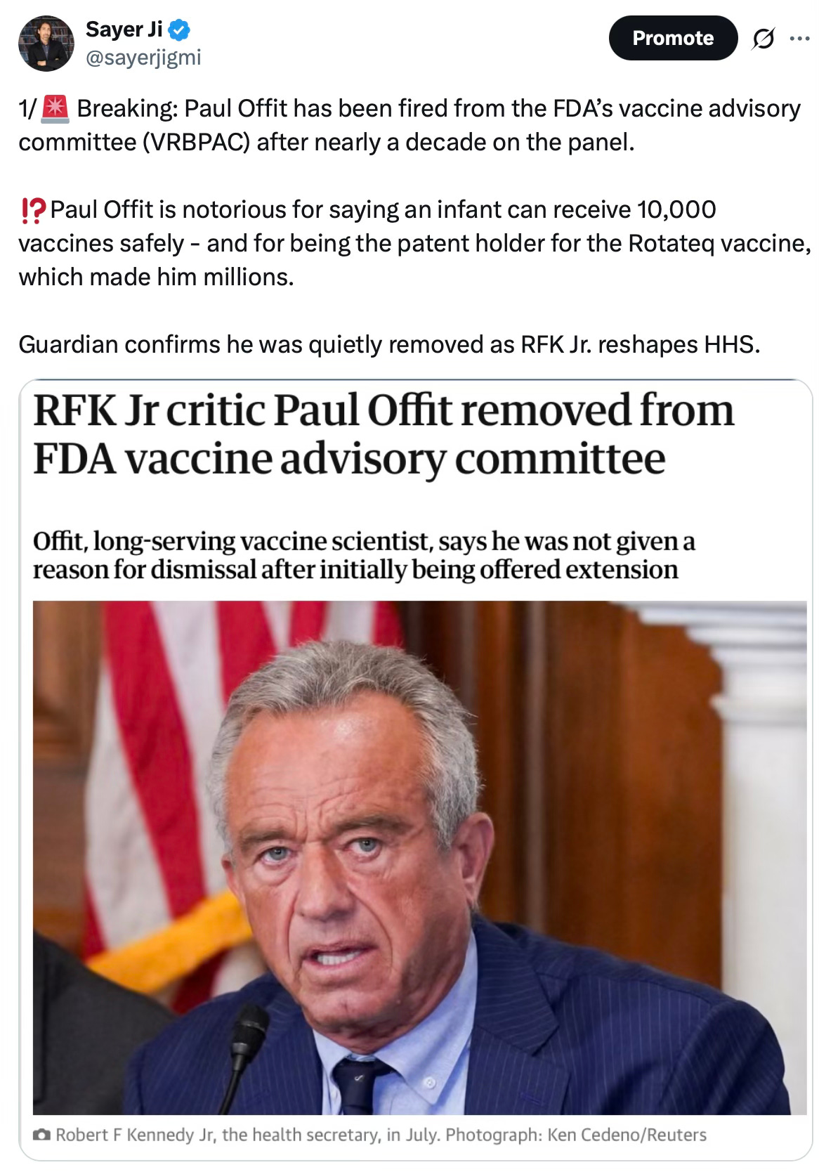 Adding to the irony, today the Guardian reported that Paul Offit has been removed from the FDA’s Vaccines and Related Biological Products Advisory Committee (VRBPAC) after nearly a decade of conflict-of-interest laden advisory. Once a fixture of official vaccine policy, Offit now finds himself sidelined, even as he lashes out with defamatory smears against RFK Jr.