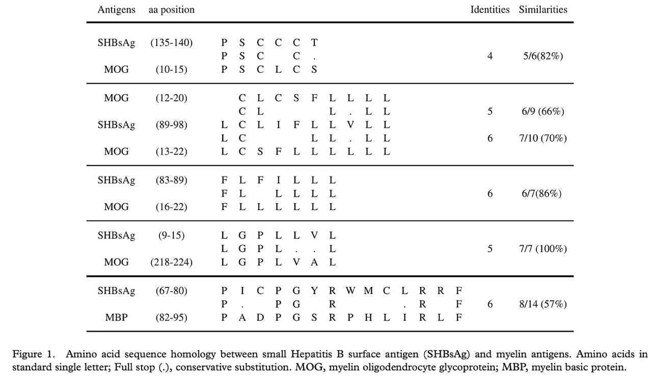 Autoimmune conditions caused by the vaccine are likely due to its antigen having a significant overlap with human myelin.