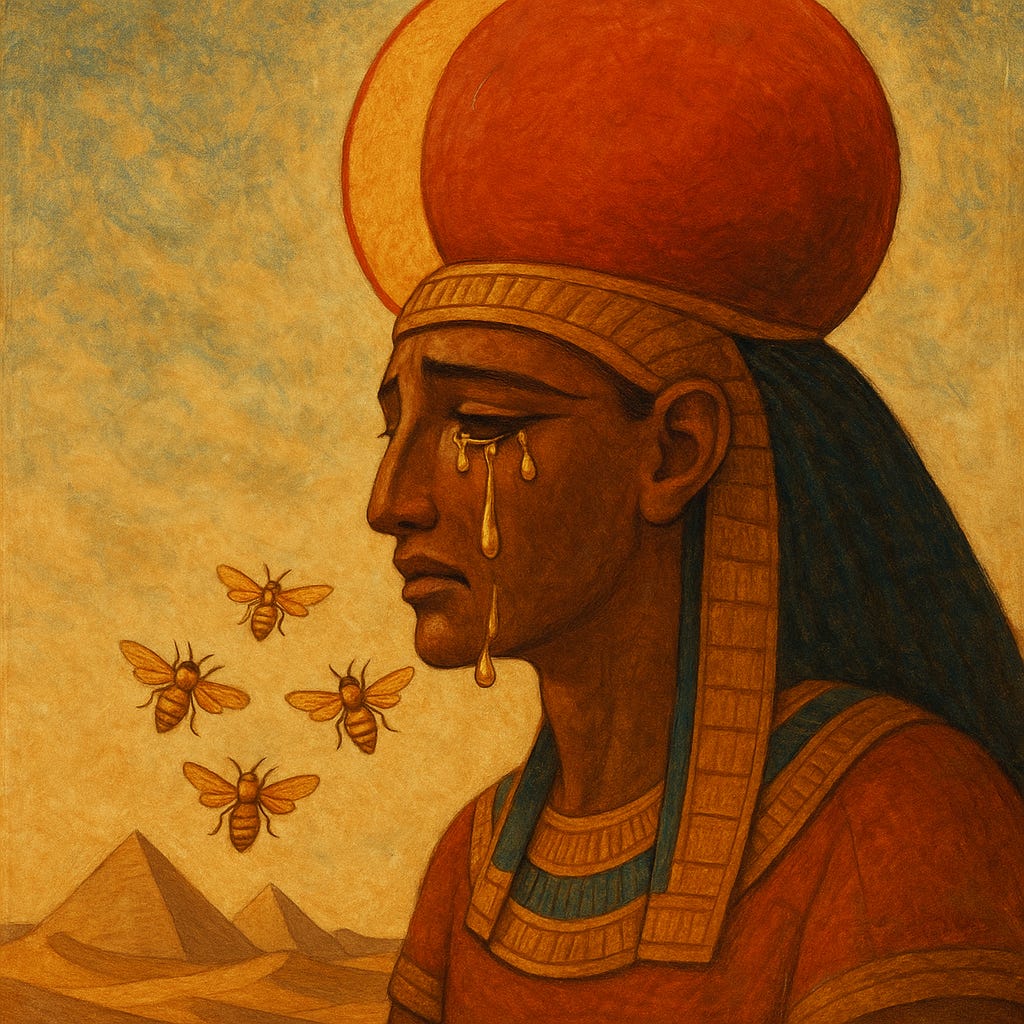 In the ancient world, bees were often seen as messengers between the earthly and divine. The Egyptians held bees in the highest regard. One of the titles of the Pharaoh was nswt-bjt, "He of the Sedge and the Bee," linking the king's identity to the bee symbol. An Egyptian myth taught that bees were born from the tears of Ra, the sun god. When Ra wept, his tears fell to the earth and transformed into bees, who brought forth honey⁸³⁻⁸⁴. Here we see bees -- and by extension their nourishing products -- as literal gifts of the gods, born of divine sorrow to give life to the land.