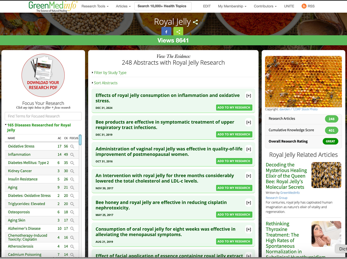 GreenMedInfo. "Royal Jelly Scientific Abstracts." https://greenmedinfo.com/substance/royal-jelly