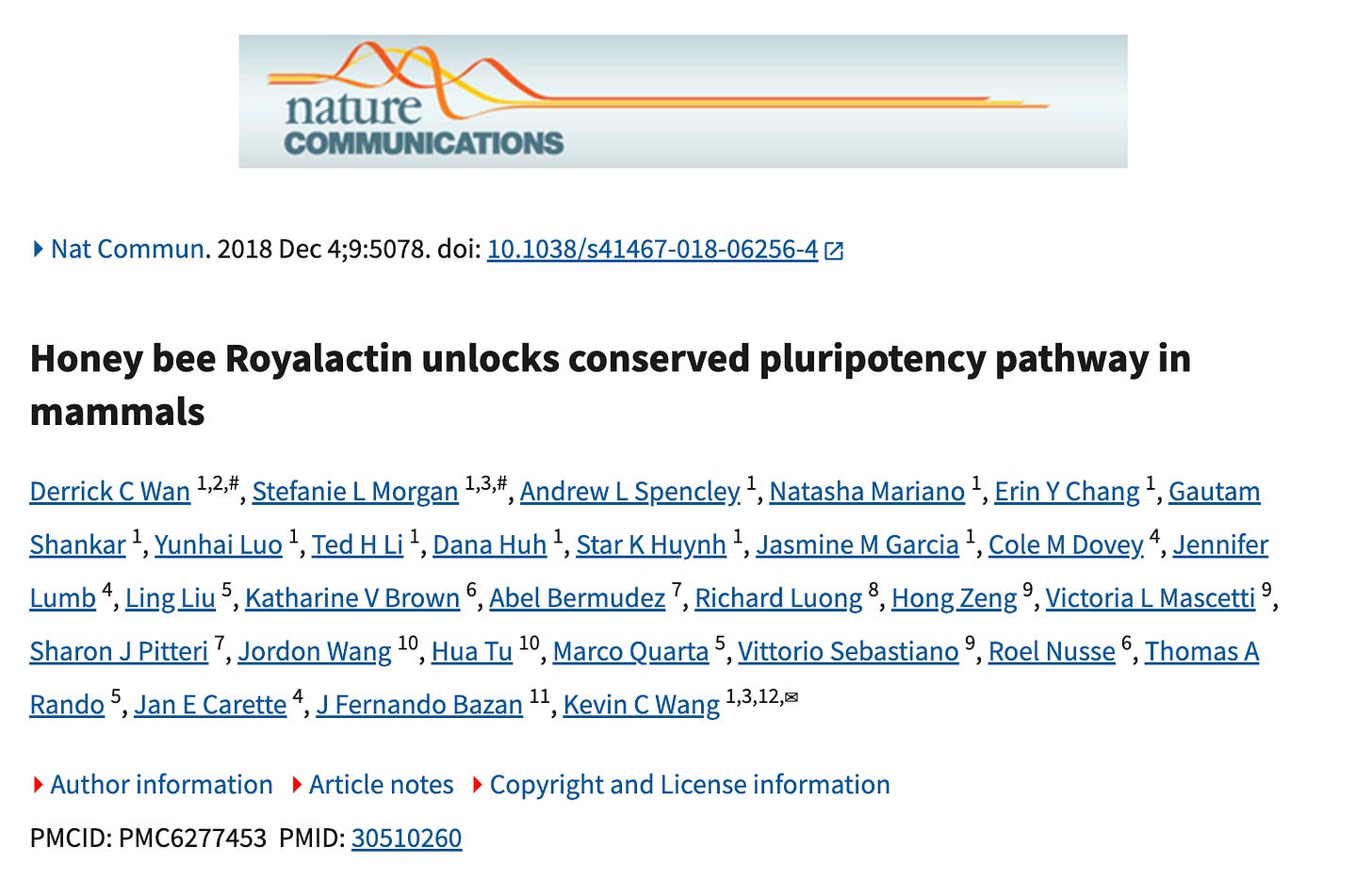 Wan, D.C. et al. (2018). "Honey bee Royalactin unlocks conserved pluripotency pathway in mammals." Nature Communications. https://pubmed.ncbi.nlm.nih.gov/30510260/