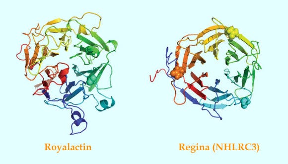 This posed a fascinating puzzle: How could an insect protein influence mammalian cells? Mammals don't produce royalactin, and yet the mouse cells were clearly responding to it. The Stanford team hypothesized that evolution might have a parallel solution -- perhaps mammals have their own protein with a structure similar to royalactin that serves a similar function in early development³⁹⁻⁴⁰. Using computational protein modeling, they searched the mouse (and human) genome for proteins with a 3D shape that matches royalactin's unique structure. They found a hit: a previously unheralded protein called NHLRC3, which is expressed in early embryos across animal species (from fish to humans)⁴¹⁻⁴². When they produced NHLRC3 in the lab and added it to mouse stem cells, it mimicked royalactin's effects -- the cells stayed pluripotent and youthful, showing the same gene expression profile as when exposed to royalactin⁴³⁻⁴². This protein was essentially a functional analog of royalactin in mammals. Fittingly, the researchers renamed NHLRC3 "Regina," Latin for "queen"⁴⁴⁻⁴⁵.