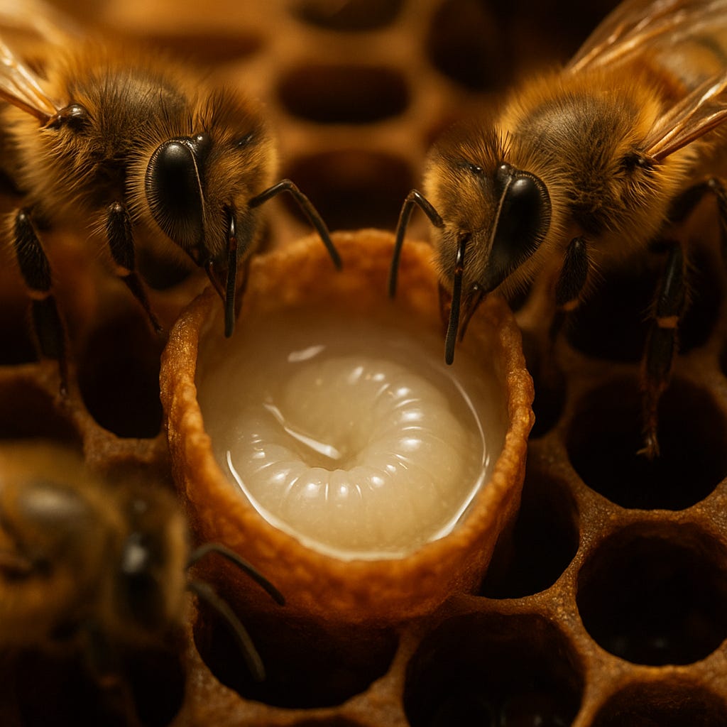 Royal jelly is often described as "bee milk," and the analogy is more than superficial. Much like a mother's milk shapes the development of a newborn mammal, royal jelly shapes the development of the bee larva. Both substances are nutrient-rich secretions evolved to feed the young, and both go beyond simple nutrition -- they carry informational molecules that guide growth, immune development, and metabolism of the offspring.