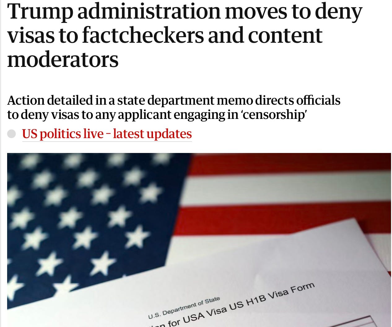 3. Richard Luscombe, “Trump Administration Moves to Deny Visas to Factcheckers and Content Moderators,” The Guardian, December 5, 2025, https://www.theguardian.com/us-news/2025/dec/05/trump-administration-us-visa-crackdown.