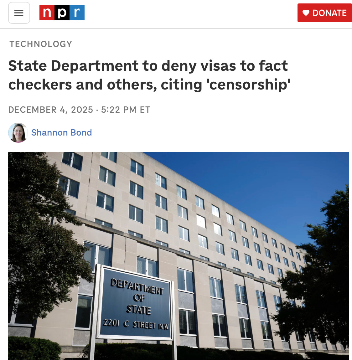 1. Shannon Bond, “State Department to Deny Visas to Fact Checkers and Others, Citing ‘Censorship,’” NPR, December 4, 2025, https://www.npr.org/2025/12/04/nx-s1-5633444/trump-content-moderation-visas-censorship.