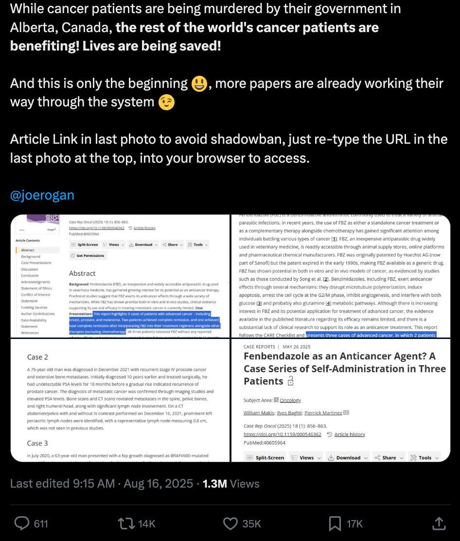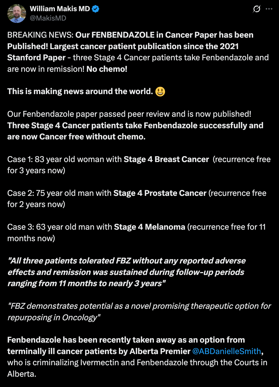 The post, which garnered over 1.3 million views, highlights three stage 4 cancer patients who achieved remission after self-administering FBZ without chemotherapy. Makis describes it as the largest such publication since a 2021 Stanford paper, tagging podcaster Joe Rogan and criticizing Alberta Premier Danielle Smith for allegedly restricting access to FBZ and ivermectin through legal actions.