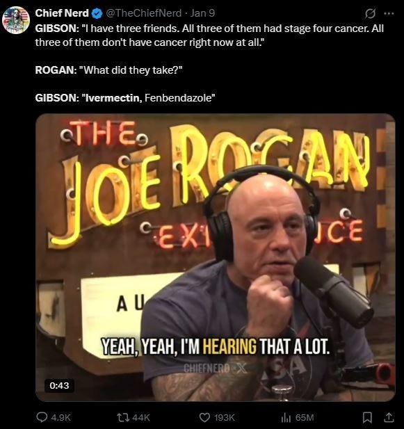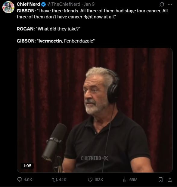In a recent viral podcast, Actor Mel Gibson told Joe Rogan that three people close to him reportedly overcame terminal cancer using extremely cheap medications normally used for parasitic infections.