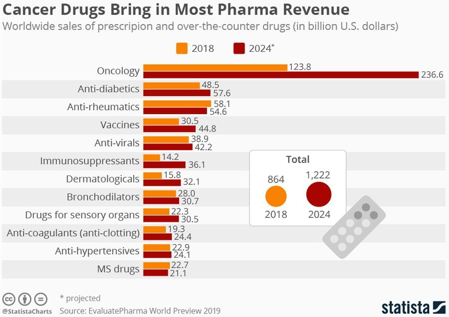 A recent report in a leading oncology journal revealed that cancer drug revenues skyrocketed by 70% between 2010 and 2019, even as sales of non-cancer drugs fell sharply.