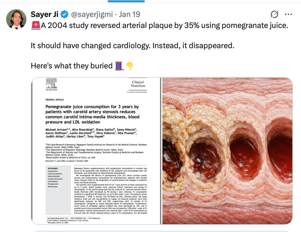 In the past two days, over 1.7 million viewed my investigation into the 2004 pomegranate study that cardiology willfully ignored—the one showing up to 35% plaque reversal in severely stenotic arteries using nothing more than three ounces of juice daily.