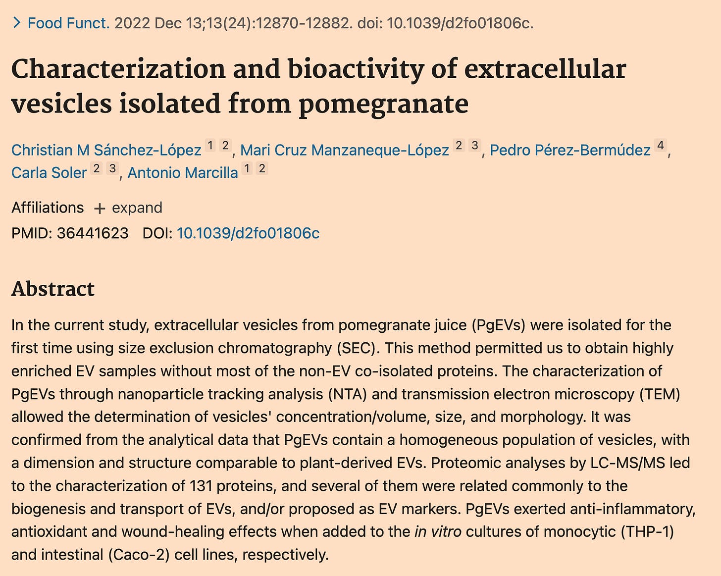 Turrini E, et al. Characterization and bioactivity of extracellular vesicles isolated from pomegranate. Food Funct. 2022;13:12930-12940.