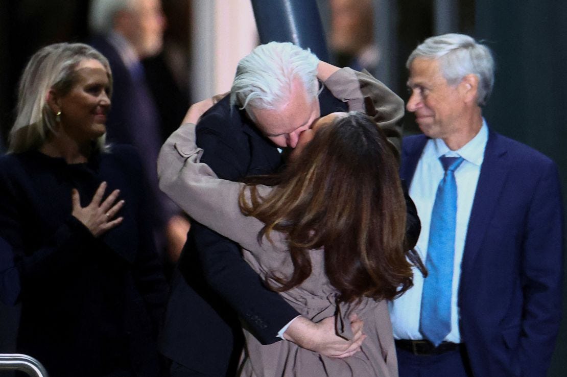 WikiLeaks founder Julian Assange kisses his wife, Stella Assange, as he arrives in Canberra, Australia, June 26, 2024