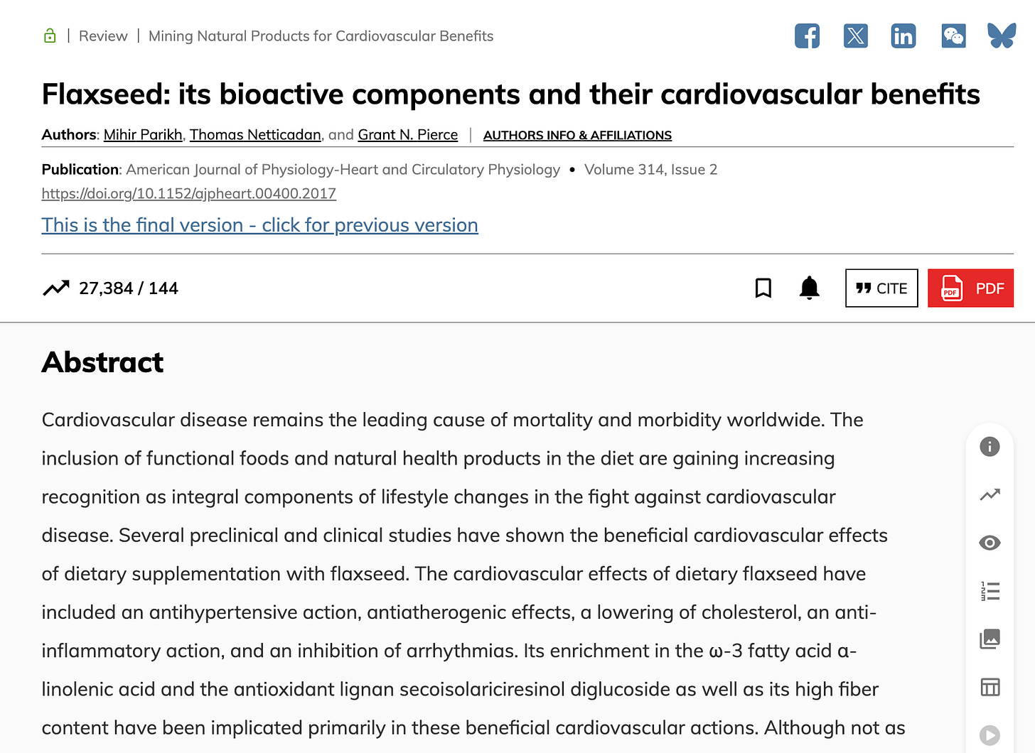 The practical implication is almost insultingly simple: two tablespoons of freshly ground flaxseed per day — mixed into a smoothie, stirred into oatmeal, folded into salad dressing — delivers a meaningful dose of ALA, SDG, and soluble fiber that decades of peer-reviewed science suggest confers real protection against breast cancer, prostate cancer, cardiovascular disease, hypertension, and chronic inflammation. Several preclinical and clinical studies have shown the beneficial cardiovascular effects of dietary supplementation with flaxseed. The data is not preliminary. It is not fringe. It is published in the American Journal of Physiology, Clinical Cancer Research, and Scientific Reports.