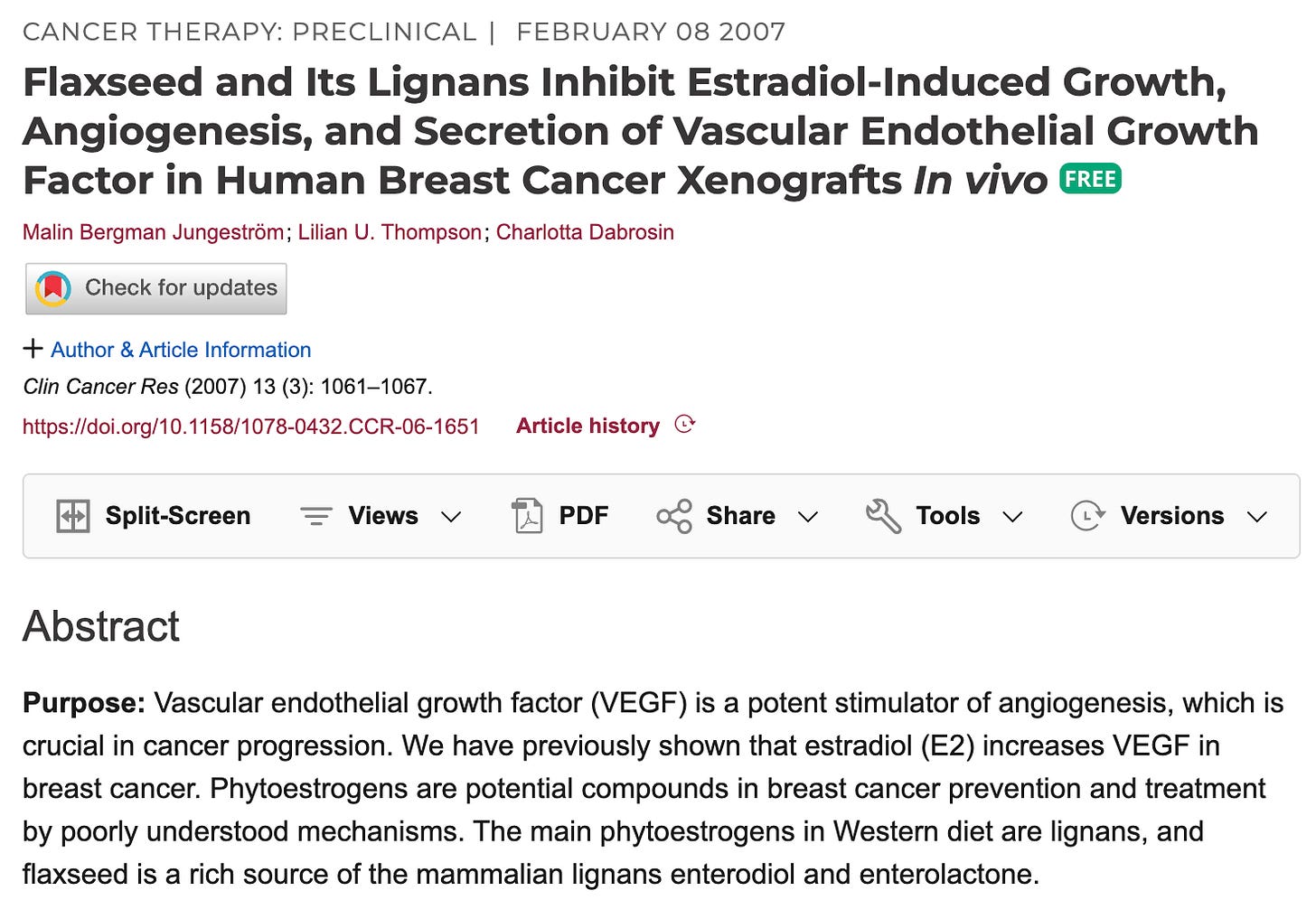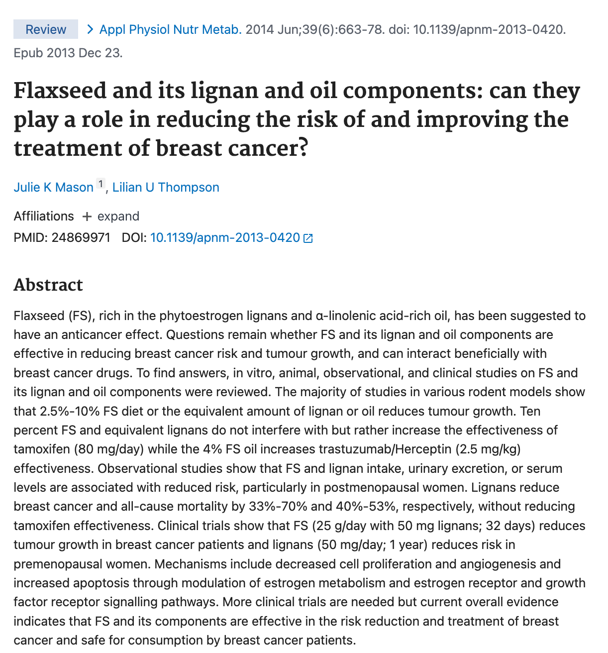 Clinical trials show that 25 grams of flaxseed per day — containing approximately 50 milligrams of lignans, taken for just 32 days — reduces tumor cell proliferation in breast cancer patients. And lignan supplementation at 50 milligrams per day for one year reduces cancer risk in premenopausal women. This is not rodent data. This is human clinical data.